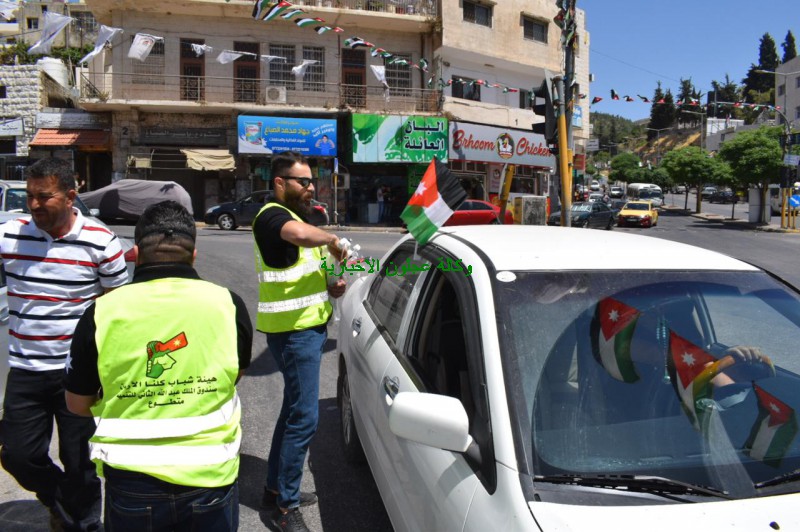 عجلون الاخبارية- بمناسبة عيد إستقلال المملكة الأردنية الهاشمية ال 75 و بدعم من وزارة الثقافة / مديرية ثقافة عجلون شارك محافظ عجلون سلمان النجادا اليوم الثلاثاء شباب هيئة كلنا الأردن وشباب المحافظة بتوزيع الأعلام الأردنية والكمامات وأوسمة شعار النهضة والهايجين على المواطنين وسط مدينة عجلون .