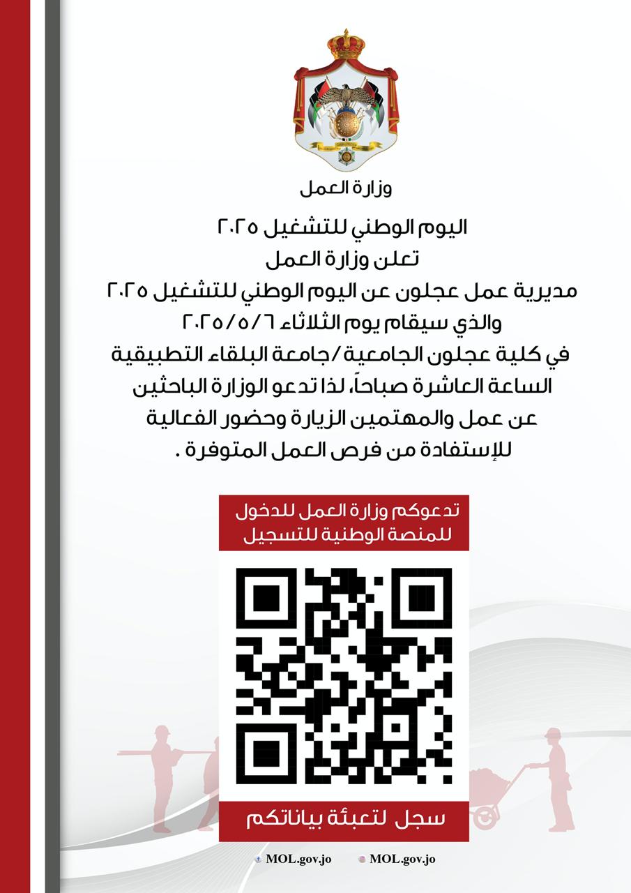 مديرية عمل عجلون تدعو لحضور اليوم الوطني للتشغيل الثلاثاء القادمأخبار عجلونية في أبريل 30, 2025 أكمل القراءة شارك