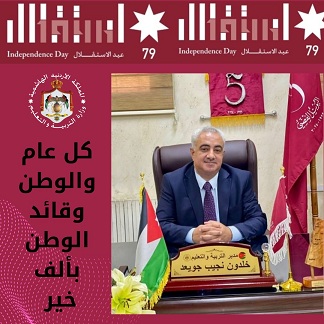 يتقدم عطوفة مدير التربية والتعليم لمحافظة عجلون الأستاذ خلدون جويعد والأسرة التربوية بأسمى آيات التهنئة والتبريك إلى مقام صاحب الجلالة الملك عبدالله الثاني ابن الحسين حفظه الله ورعاه وولي عهده الأمين سمو الأمير الحسين بن عبدالله والأسرة الهاشمية بمناسبة عيد استقلال المملكة الأردنية الهاشمية التاسع والسبعين.