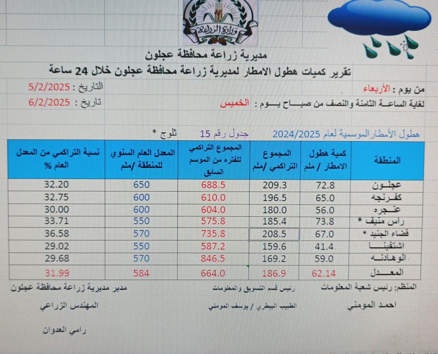 مدير زراعة عجلون : نسبة التراكمي من المعدل العام لهطول الأمطار بلغت 31،99%