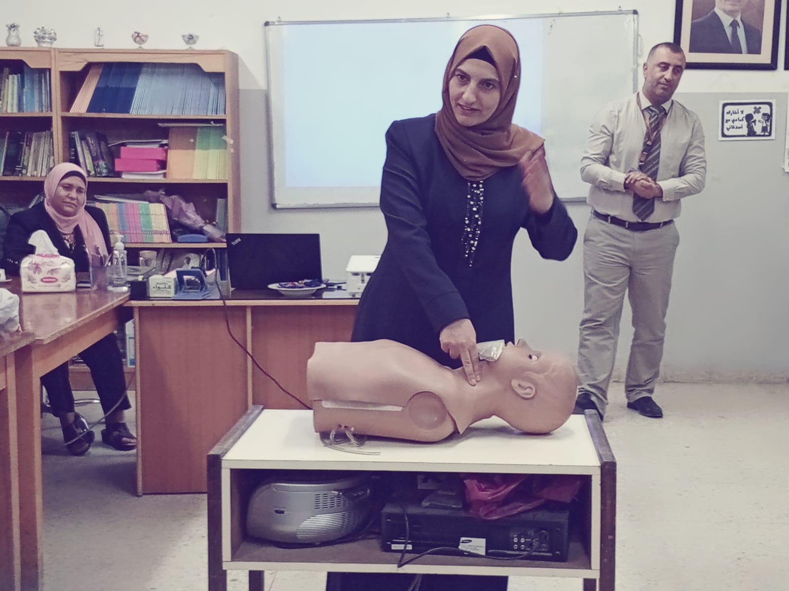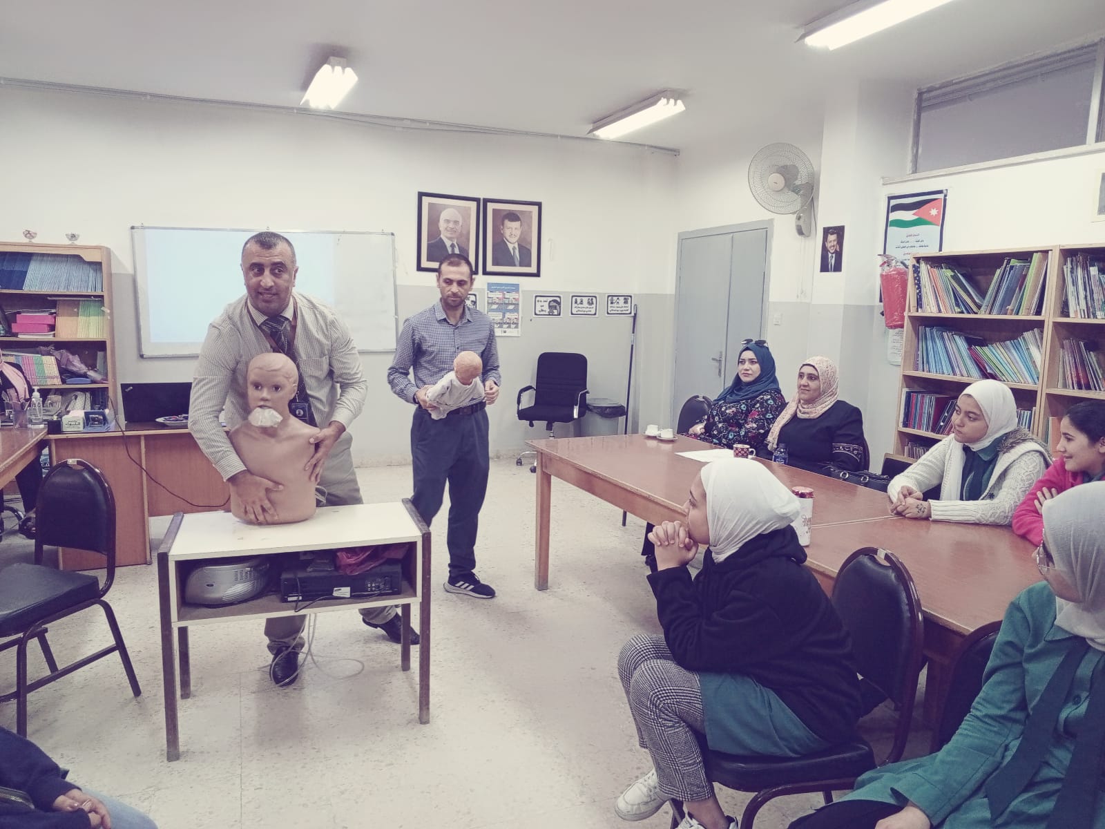 وقام رئيس وحده التدريب والتعليم الطبي المستمر حذيفه المومني ونائب رئيسه التمريض ختام المومني و منسق التدريب والتعليم عباده الزغول و منسقه التدريب والتعليم سناء الصمادي بتدريب الطالبات والمعلمات على الانعاش القلبي وكيفيه انقاذ حياة المريض ، كما تم تناول العديد من الحالات التي قد تحصل مع الطالبات وكيفيه علاج هذه الحالات بابسط الطرق.