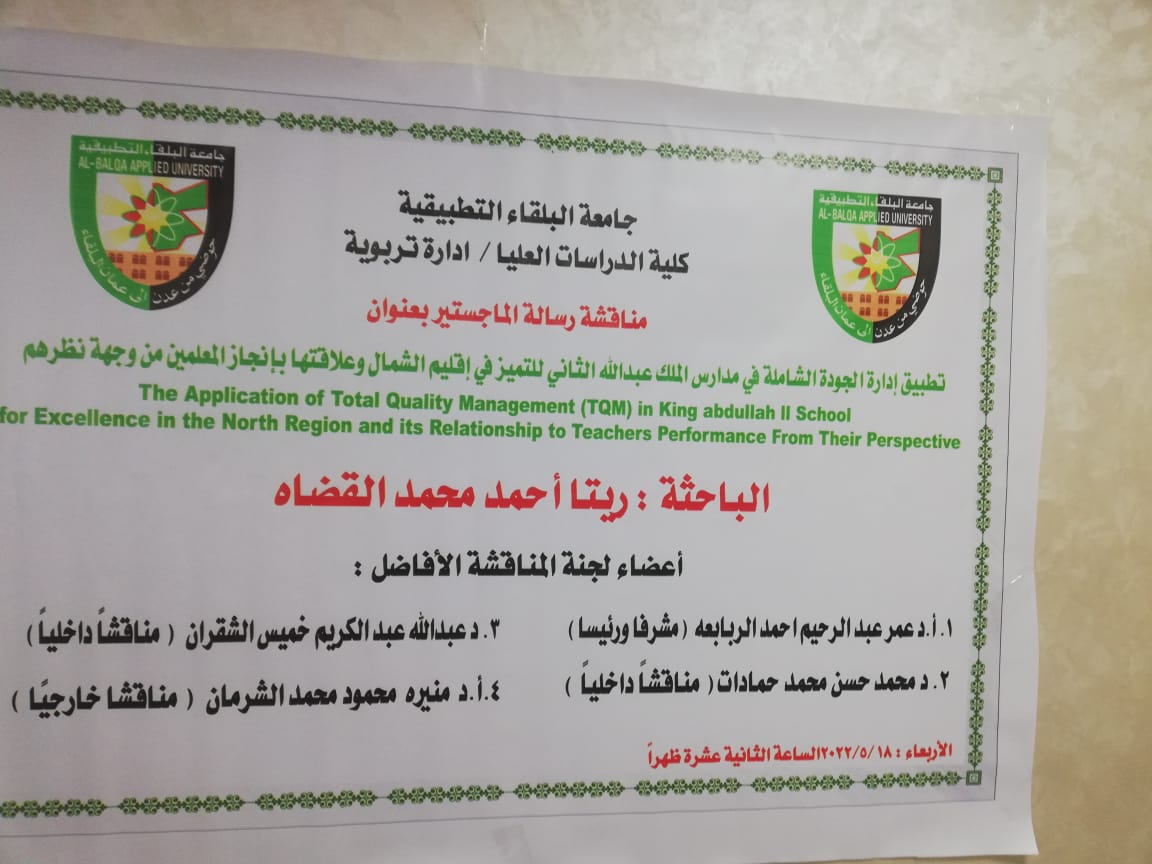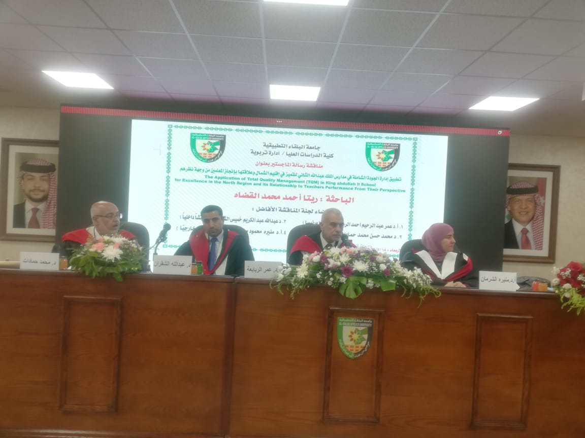 تم مناقشة رسالة ماجستير للطالبة ريتا احمد القضاة في كلية عجلون الجامعية /جامعة البلقاء التطبيقية بعنوان (تطبيق إدارة الجودة الشاملة في مدارس الملك عبد الله الثاني للتميز في أقليم الشمال وعلاقتها بإنجاز المعلمين من وجهة نظرهم )