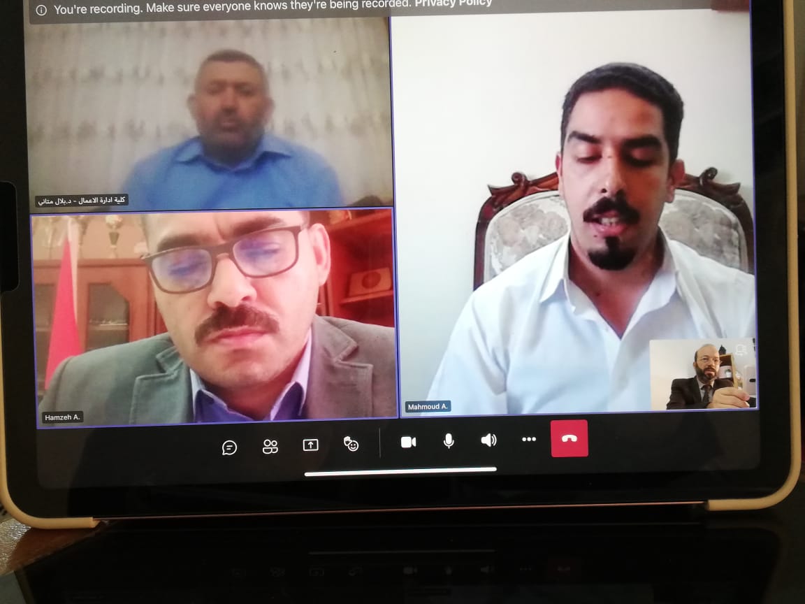 وقد تشكلت لجنة المناقشة من الدكتور ياسر المومني رئيساً ومشرفا والأستاذ الدكتور محمود الروسان مناقشاً داخلياً والأستاذ الدكتور زكريا احمد العزام مناقشاً خارجياً. واجيزت الرسالة بتعديلات طفيفة