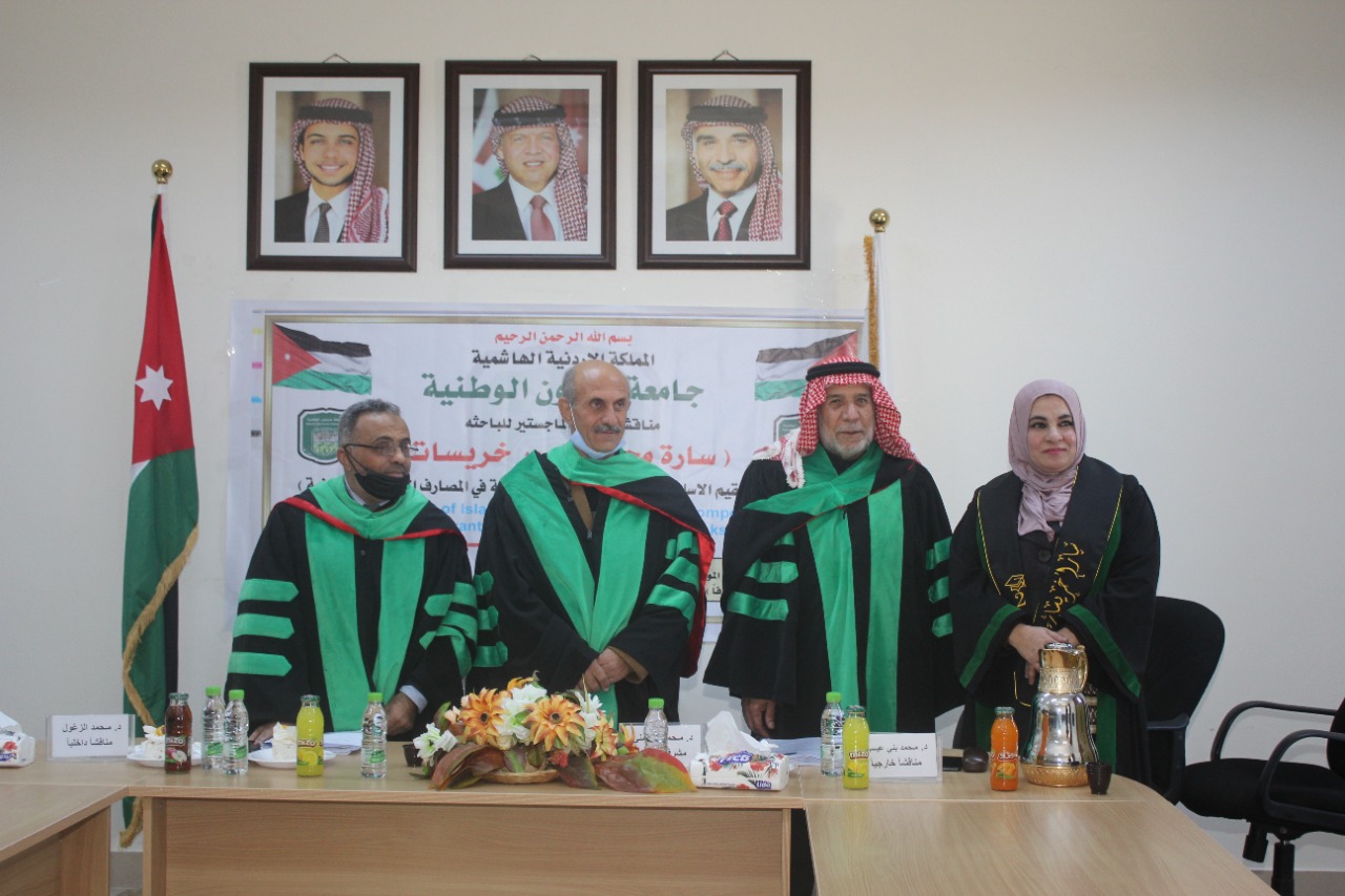 الاولى كانت للطالبة: سارة محمد خريسات / قسم المصارف الإسلامية وعنوان رسالتها ” أثر القيم الإسلامية في تعزيز الميزة التنافسية في المصارف الإسلامية الأردنية ”