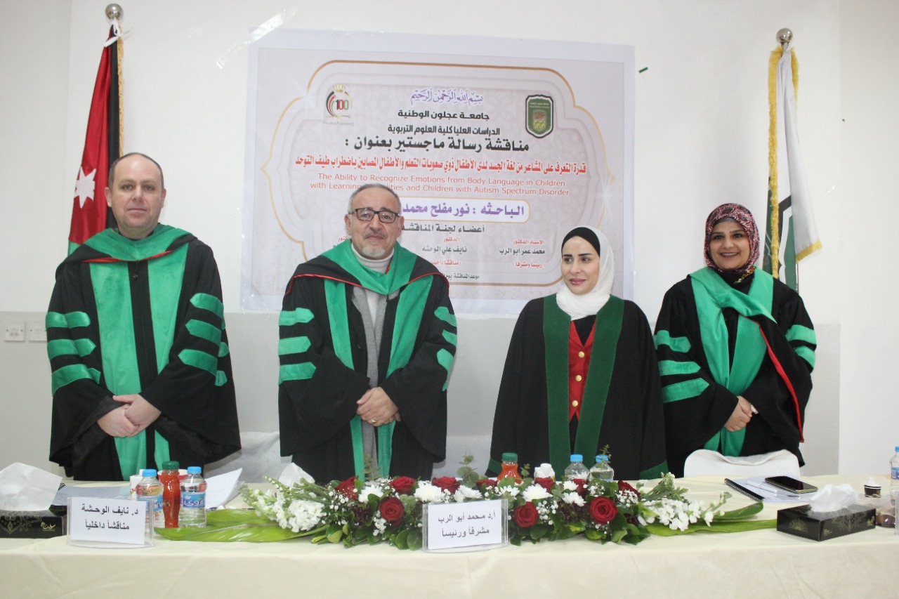 أما الرابعة فكانت للطالبة : نور مفلح محمد فرعومه / قسم صعوبات التعلم وعنوان رسالتها : “قدرة التعرف على المشاعر من لغة الجسد لدى الأطفال ذوي صعوبات التعلم والأطفال المصابين باضطراب طيف التوحد ”