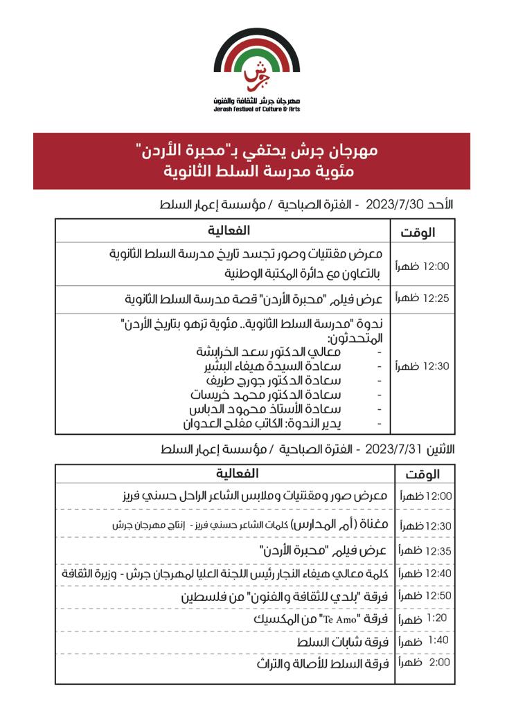 مهرجان جرش يحتفي ب ” محبرة الأردن” مئوية مدرسة السلط الثانويةأخبار ثقافية وفنية في يوليو 18, 2023 =أكمل القراءة شارك