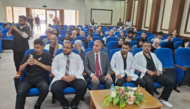 وتضمن النشاط الذي أداره الطالب حمزه عناب محاضرة توعوية قدمها الدكتور معتز ابوعيسى طبيب العيادة في الكلية تناول فيها أهمية الفحص المبكر لسرطان الثدي، مؤكدًا أن الكشف المبكر يرفع نسب الشفاء بشكل كبير، كما تطرق إلى تصحيح المفاهيم الخاطئة المرتبطة بالمرض وشرح طرق الوقاية والعلاج المتاحة.