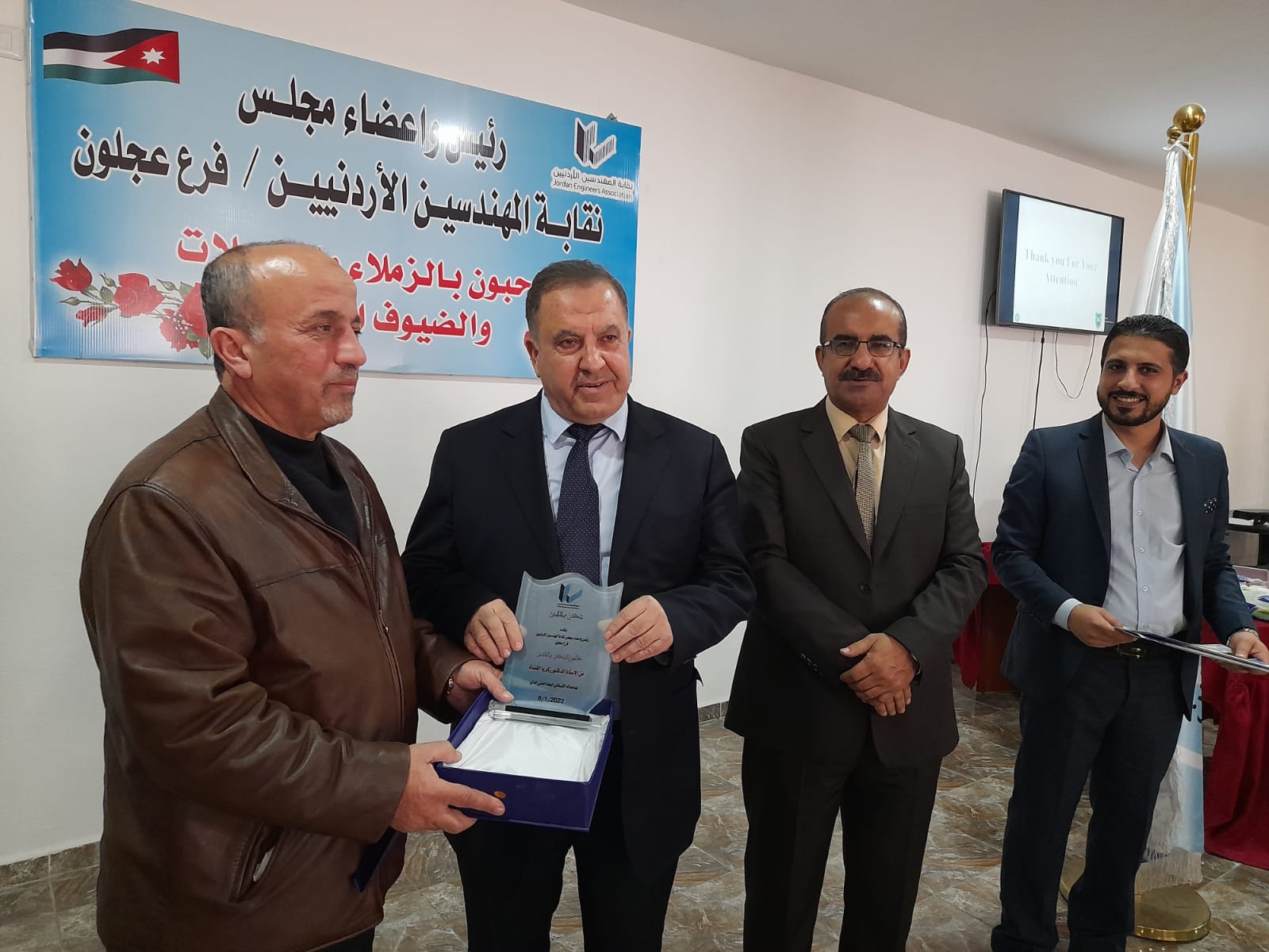 وفي نهاية الاحتفال الذي أقيم في فرع النقابة بحضور عدد من أعضاء مجلس الفرع والهيئة العامة ومنسق الفرع علاء الجلابنه كرم المهندس عنانزه والدكتور محمد نور الصمادي الدكتور القضاة بدرع تقديرية كما تم تكريم المهندسة ثراء الزغول لتميزها في شهادة ماجستير الهندسة المدنية من الجامعة الاردنية.