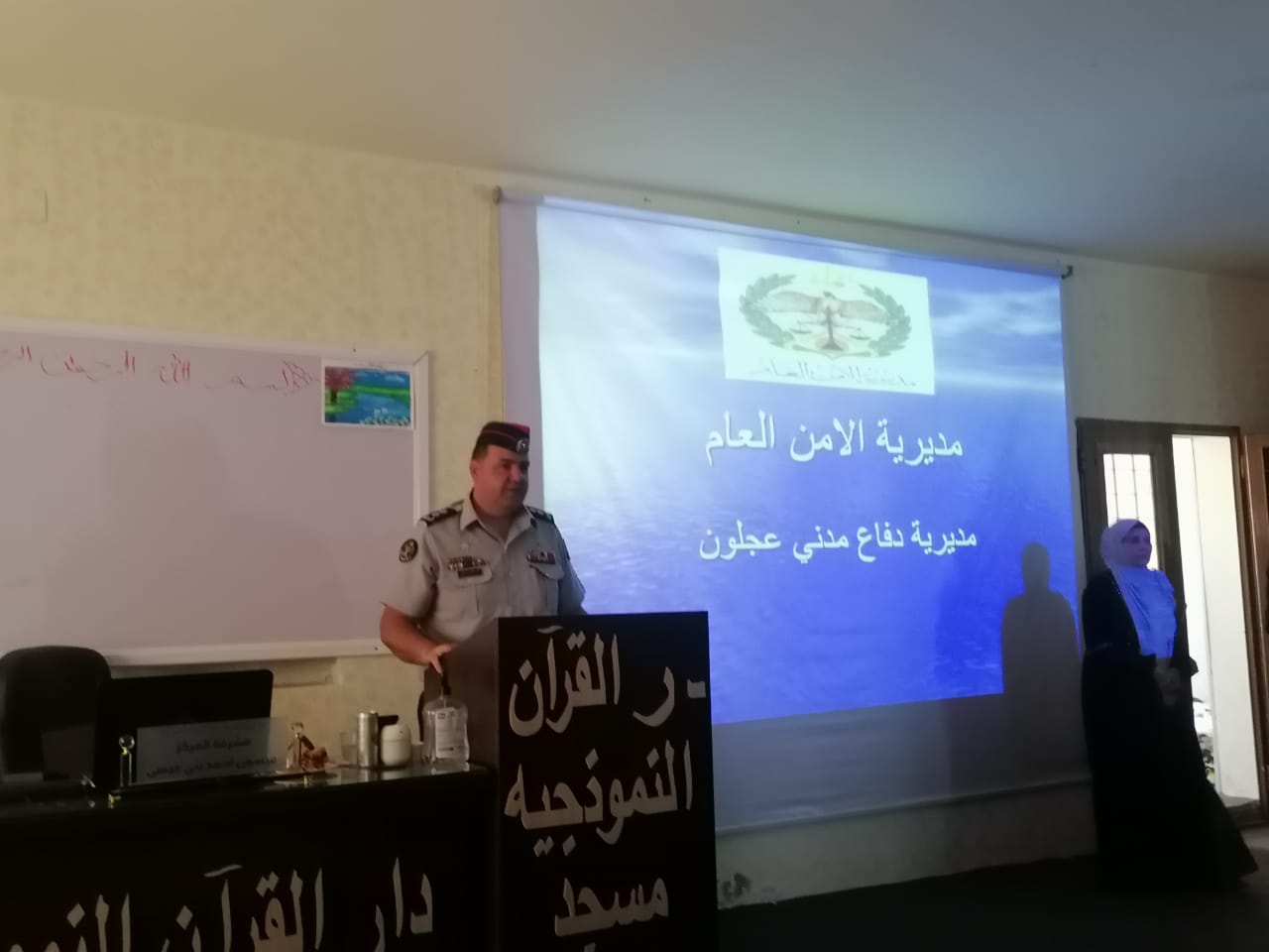 تحت رعاية رئيسة قسم الشؤون النسائية في محافظة عجلون السيدة بثينه المومني وبالتشاركية مع مديرية الدفاع المدني أُقيمت  في دار القرآن الكريم في مسجد عصيم والمركز الصيفي ورشة بعنوان( السلامة العامة)  و( مكافحة الحرائق) والتي  شارك فيها  ٧٠ طالبة وسيدة.