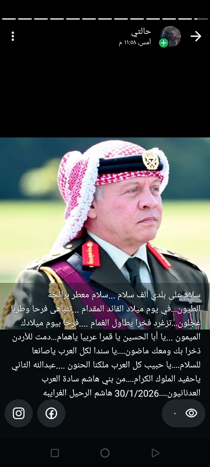 سلام على بلدي ألف سلام …سلام معطر برائحة الطيون…في يوم ميلاد القائد المقدام …تتباهى فرحا وطربا عجلون…تزغرد فخرا يطاول الغمام ….فرحا بيوم ميلادك الميمون …يا أبا الحسين يا قمرا عربيا ياهمام…دمت للأردن ذخرا بك ومعك ماضون….يا سندا لكل العرب ياصانعا للسلام….يا حبيب كل العرب ملكنا الحنون ….عبدالله الثاني ياحفيد الملوك الكرام….من بني هاشم سادة العرب العدنانيون….30/1/2026 هاشم الرحيل الغرايبه
