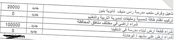 وحظي قطاع التربية والتعليم بالحصة الأكبر كالعادة ضمن الموازنات السابقة ، حيث يعتبر قطاع التربية من أكثر القطاعات التي تحتاج الى بناء مدارس جديدة وإضافات غرفة صفية بإستمرار نظرا لزيادة عدد السكان والهجرة أحيانا من المدارس الخاصة الى المدارس الحكومية .