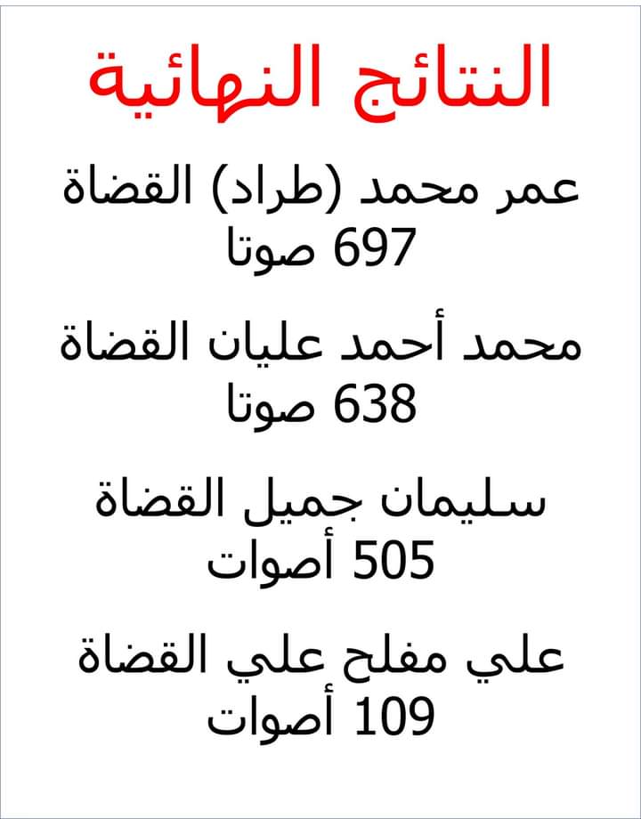 أعلن رئيس لجنة الإنتخابات الداخلية لعشيرة القضاه المحامي أحمد حسن القضاه  عن فوز المحامي عمر القضاه بالإنتخابات الداخلية لعشيرة القضاه بحصوله على 697  في الإنتخابات التي جرت اليوم الجمعة بصالة الطحان .