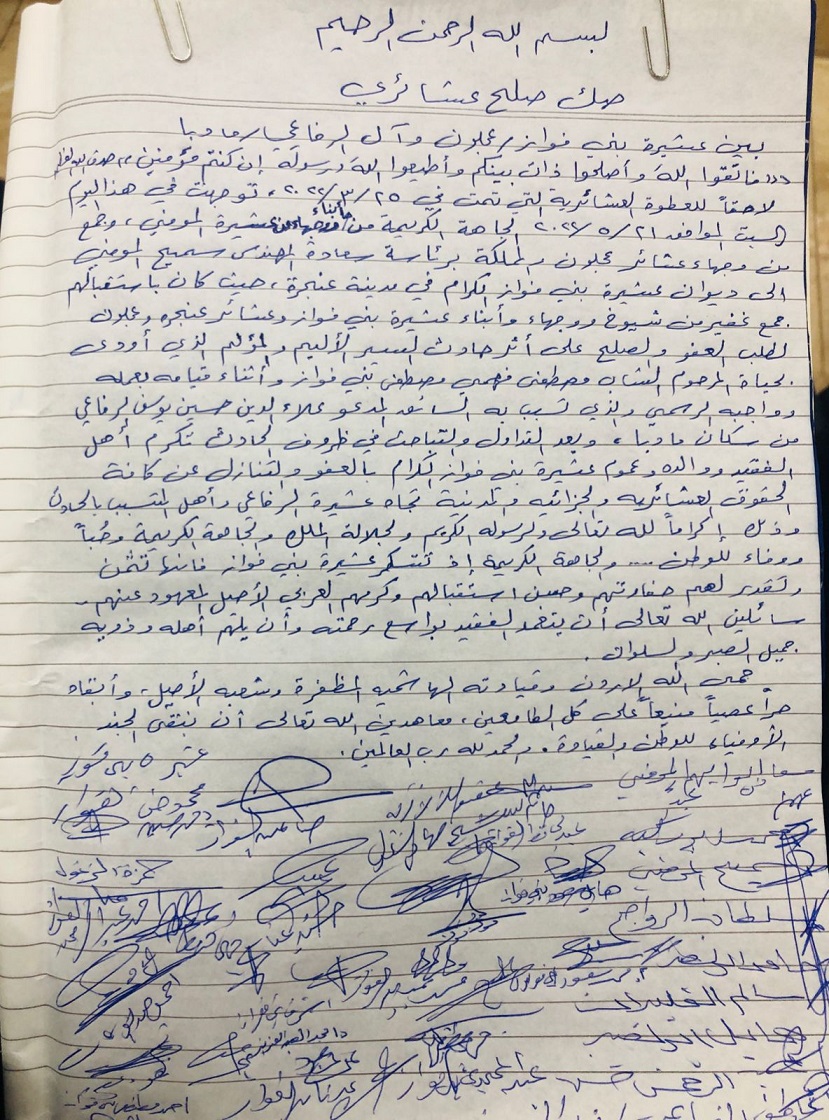 وتاليا نص الصلح العشائرين بين عشيرة بني فواز في محافظة عجلون – مدينة عنجرة وبين عشيرة آل الرفاعي في مدينة مادبا الذي قادته عشيرة المومني ممثلة بسعادة المهندس سمحيم المومني ووجهاء العشيرة