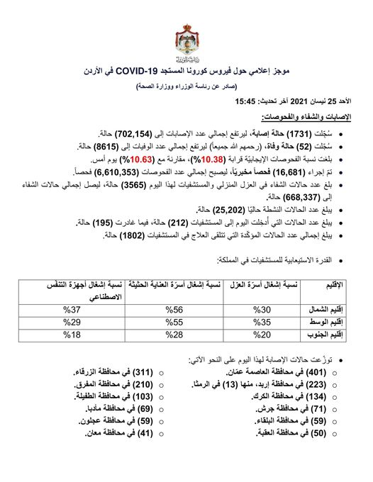وحول القدرة الاستيعابية للمستشفيات في المملكة، بين الموجز أن نسبة إشغال أسرّة العزل في إقليم الشمال بلغت30 بالمئة، بينما بلغت نسبة إشغال أسرّة العناية الحثيثة 56 بالمئة، فيما بلغت نسبة إشغال أجهزة التنفّس الاصطناعي في الإقليم ذاته 37 بالمئة.