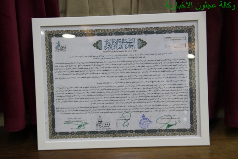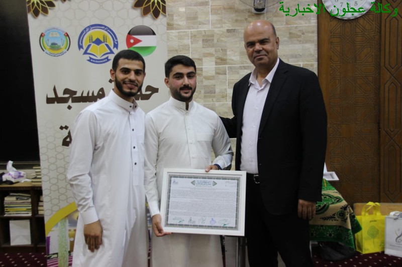 رعى مدير أوقاف محافظة عجلون الدكتور أحمد محمود الصمادي مساء اليوم الخميس في مسجد الصحابة/ عنجرة؛ حفل مركز  الرحمن القرآني في مدينة عنجرة لتكريم الحافظ لكتاب الله محمد عبدالله عبدالحميد الزغول بروايتي حفص وشعبة عن عاصم بسند غيبي متصل بالنبي صلى الله عليه وسلم.