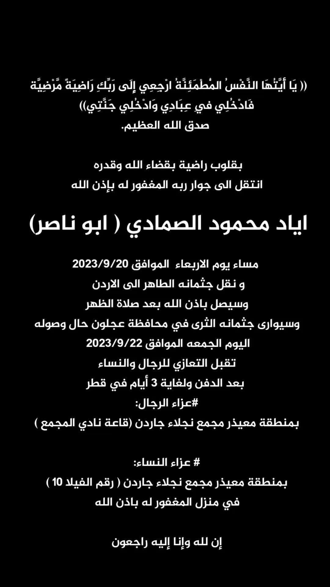 عجلون الإخبارية: انتقل الى رحمة الله تعالى في دولة قطر   الشاب  اياد محمود الصمادي (أبوناصر) ، وقد شيع جثمان المرحوم الطاهر اليوم  الجمعة في مدينة عنجرة .