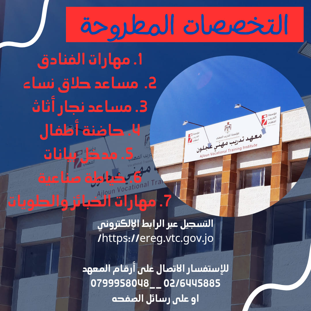يعلن معهد تدريب مهني عجلون عن فتح باب القبول والتسجيل للدور الأول إعتباراً من يوم غد الأحد 18/2/2024